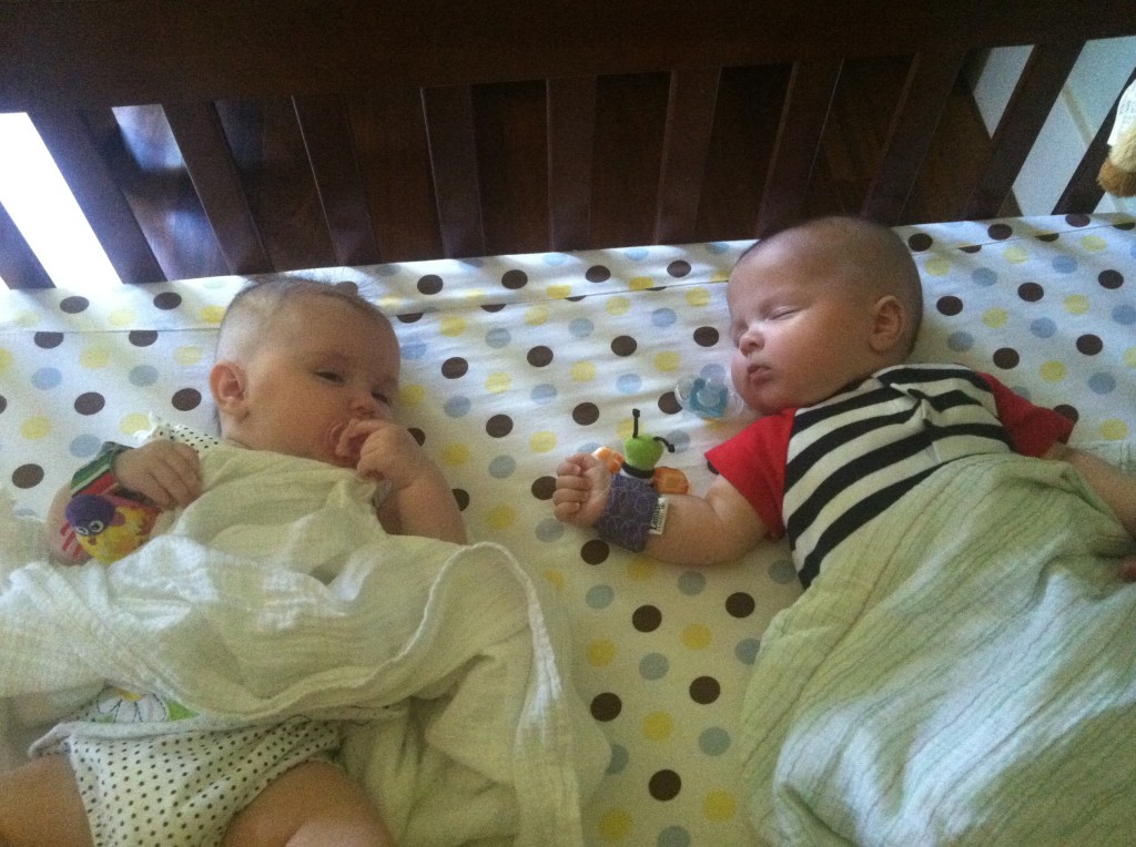 The moment we get into the nursery we all relax. Just upstairs Jack and Fiona were crying, grabbing the spoon, covering themselves in pea soup. Me, getting more and more frustrated, looking at the mess to clean after I put the babies to bed. Downstairs I set the lighting, I turn on a nursery songs cd. I take off Fionas clothes covered in crusty reminders of today, then Jacks. I fill the tub. I take off my clothes too, after the bath we do skin to skin. Fiona blows onto my belly like Alan and I have been doing to them to make them laugh. The babies walk around the nursery in thier diapers, they mouth their teddies, look at books, show me pictures in “Whats on my head” and “The hungry Caterpillar.” I relax on the futon, I get to see moments when they sit side by side analyzing the same book or toy. Every few minutes they come over to me, climb over my legs, lay next to me. I try to give Jack a cuddle but he rejects, he wants to be free. Fiona gladly accepts a hug. They practice their walking and clapping skills until they get so tired they start focussing on their lovey’s. It’s time to put their pajamas on and feed them their bottles. I say goodnite and leave the nursery. I am glad most of my workday is done, except I still need to cook dinner and clean the kitchen. I feel satisfied with the job I did with the babies, and part of me misses them already.