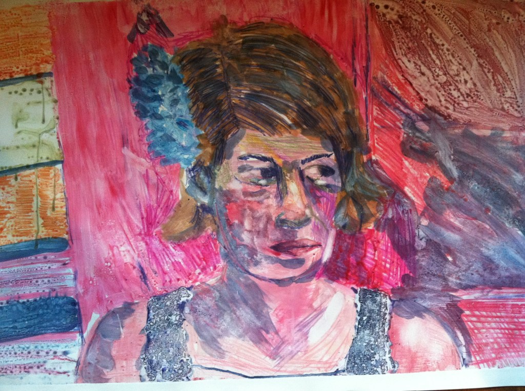 Shaven legs, been using lotion. Drinking lots of water. Eating well, tummy feeling full, gorged on cake and watermelon. Drinking tequila, can’t get drunk. Only drank one, nursing second one now. Felt free, listening to Sweet Home Alabama, put on a sexy dress, sweeping floor, dancing, saying, “Hi jack! Hi Fiona.” Smile, giggle me, them. This is my dream, to be carefree and fun loving. Always have been, except when I’m down. Take last sip of Tequila. Make a second? Feeling good now, babies asleep, Alan asleep on the couch. I hear a little bird chirping, the hum of the freeway, a saw, someone doing DYI. Kids at the park saying sentences, I can’t make out what they are saying. A car door here a dog barking there. My stomach hurts a little. I’m too conscientious to get drunk or eat anything else. When the babies wake up I will get a closer look at the neighborhood. Billy needs a walk, I’ll wear a hat and sunglasses. I’ll make another margarita. Drink more water. 1/2 a shot of tequila, 1/2 a shot of lime juice and ice in a little tiny goblet. Yum, the new margarita is good. The trash is full. The flowers in the interesting crystal vase with a geometric design of cuts, making triangle ridges that we got as a wedding present that I didn’t like at first but now has grown on me are dead. The water is murky. If I smelt it I know what it would smell like, pond water. There are a few flowers that have survived. Yellow with long tiny petals and two white and purple lilies. The painting of my mom’s dad, he wore a check suit and was a used car salesman, not in the painting. It’s just a portrait, but in the old black and white photographs I’ve studied, he wore check suits. The painting is in a dark corner of the room. The dominant sounds are the birds and freeway, things Fiona couldn’t hear without her hearing aids. Now I am feeling tired. I don’t know about a walk, I’m leaning towards a bath. Or paint! I could totally go paint right now. I’ll bring the baby monitor and my margarita. I’ll just paint super-fast. Just for fun. Then If I have time before any one wakes up I’ll take a hot bath. If they wake up before I’m done painting I’ll take the babies and Billy for a buzzed Sunday afternoon walk on time change day. Good Bye.