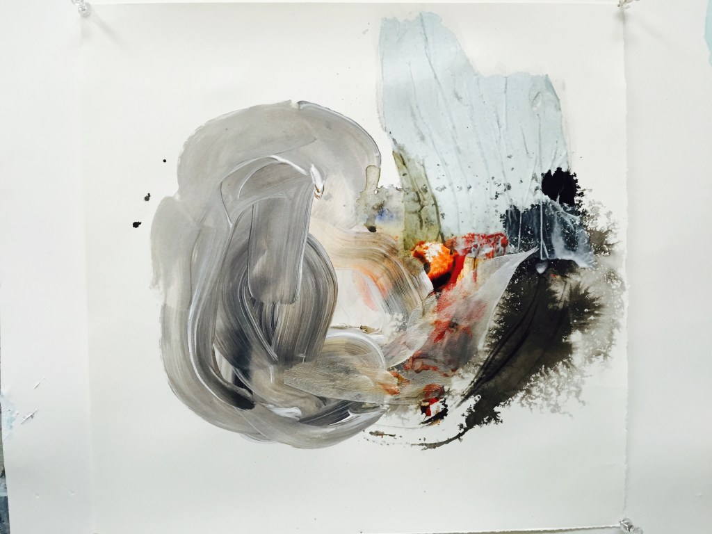 Images have been in my mind since the day I put Zappa down, blues, whites, grays, centrally located on the paper. I couldn’t wait to get into the studio. Yesterday I took Billy and the babies for a walk early so I could go straight to the studio when Ramona arrived. I took my water and fish, ate an early lunch so I could keep going all day without coming upstairs. I took down my Lenox 100, an economical paper for painting and printmaking. I tore it into several smaller pieces. I wet the paper. Start with ink and watercolor. I feel completely present, it’s quiet, mind relaxed. I channel my mom. I touch the paintbrush on the paper, the color spreads like a spill on the floor. “Mom, this is for you.” I begin adding collage, more paint, I’m thinking of delicateness. Softness like the babies cuddles. Softness which is my body. Transparency of life when you encounter death. A path to explore, more stains to be made. Memories to uncover. Coffee to drink. Cheerios to pick up off the floor. Thursday morning, back in the kitchen. Babies screeching. From making to cleaning. Drinking whole pot of coffee today. No babysitter today. No studio today. It’s play day. A day to inspire Jack and Fiona, to show them something new and wonderful, a petting zoo a duck pond. My mom said I didn’t have the discipline to work in the studio for hours when I told her I wanted to be an artist. She said I could never spend that much time alone. But I crave that time, those hours alone in my studio working. My mom was impressed when she saw me becoming that artist, when she saw my dedication. I wish she could see my paintings now. I wish I could see her paintings now. She was a wonderful artist.
