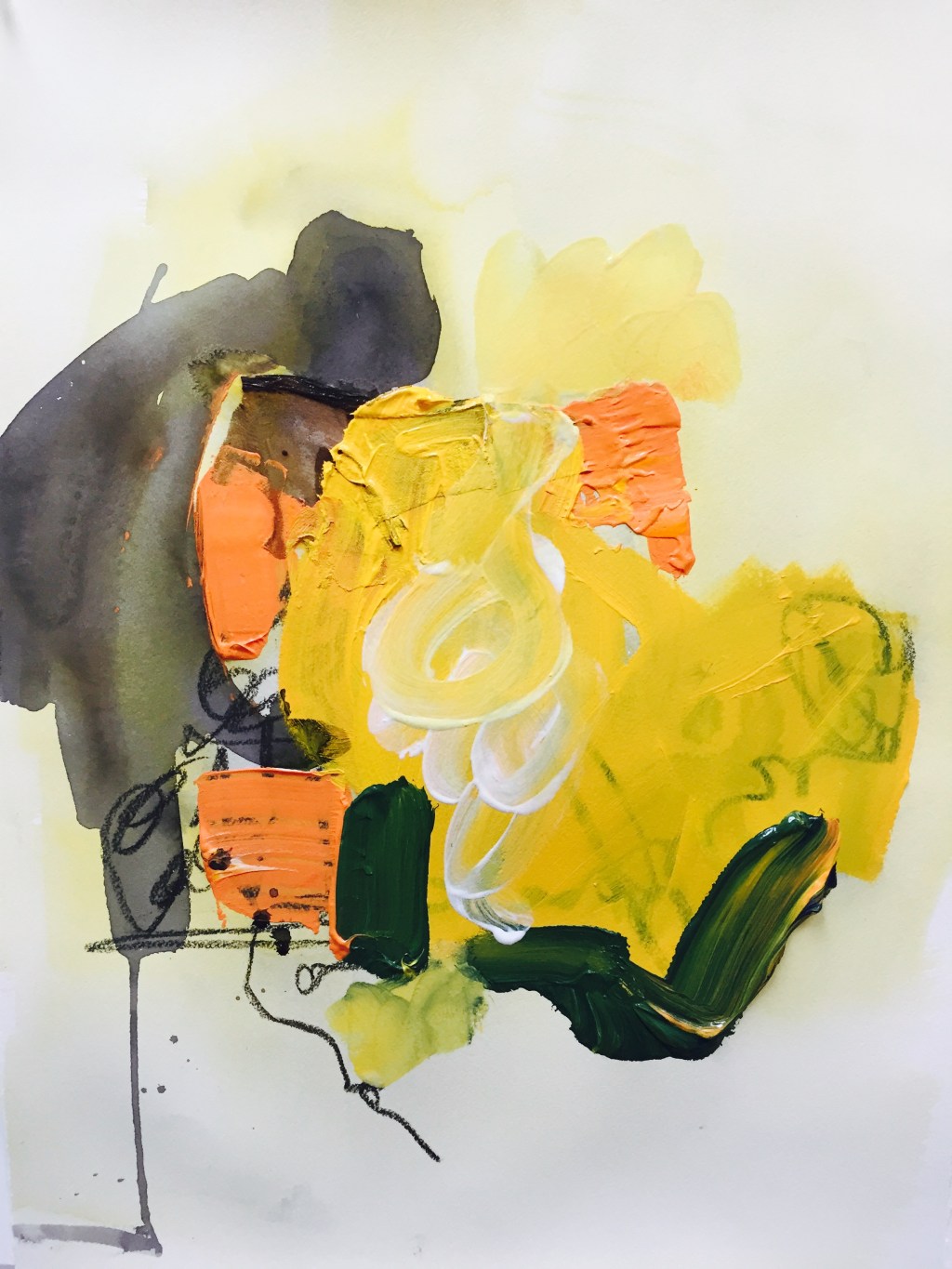 The fan above my head brings a slight chill to my hands. It’s hot outside this afternoon. So quiet at this moment. Peaceful. Jack and Fiona are sleeping soundly. I feel completely at ease, things are different now. I know what I have to do, what I need to work on. My husband texts me: “I’m going to check out Sprouts. Do you want anything?” (It’s a new grocery store down the street) I reply, “I’m so jealous!!!Bring home some yummy foods for us and the babies!” I also gave him a list of vegetables for the juicer. I’m excited about the new grocery store. There are days when I just say, “No” or “nothing” or “whatever.” My poor husband. I painted today. Made two pieces I really like. Inspired by a group I joined on Facebook called Asemic Writing. I was intrigued by the images people were posting. “The word asemic means “having no semantic meaning.”( Wikipedia) “The meaning is left for the reader to fill in and interpret.” I listen to the babies babble on the monitor when working in my studio. The frequencies of their voices influence my paintings, the lines, the colors. Sometimes I am relaxed, the babbling is sweet and content. Other times I am on edge, I can’t tell if the babbling will turn into a cry, its high pitched, whiny, and piercing. Jack and Fiona inspire my painting and writing practice. I’m paying close attention, letting them explore, giving them beet tops to chew and examine, room to room, drawer to drawer, replacing dangerous items with fun finds. I watch them get delighted. I come upstairs after I put them to bed and am upset. The first thought that comes to my mind is why didn’t Alan help pick up? There are diapers, magazines, tortillas, toys, everything is a mess, have to clean it. I start picking up the diapers and magazines. A smile comes to my face. I don’t mind that Alan didn’t help anymore, I’m not upset I have to clean up by myself, I’m only thinking about how much fun they had and what they learned when the mess was being made. All my paintbrushes are hard. My studio is a mess. I am very productive. The paper I’m using now is imbedded with information. Age has discolored it slightly, given it an antique look and feel. The smell of musk released as I wet the paper, gives me a feeling, a reminder of people no longer on earth. A memory.