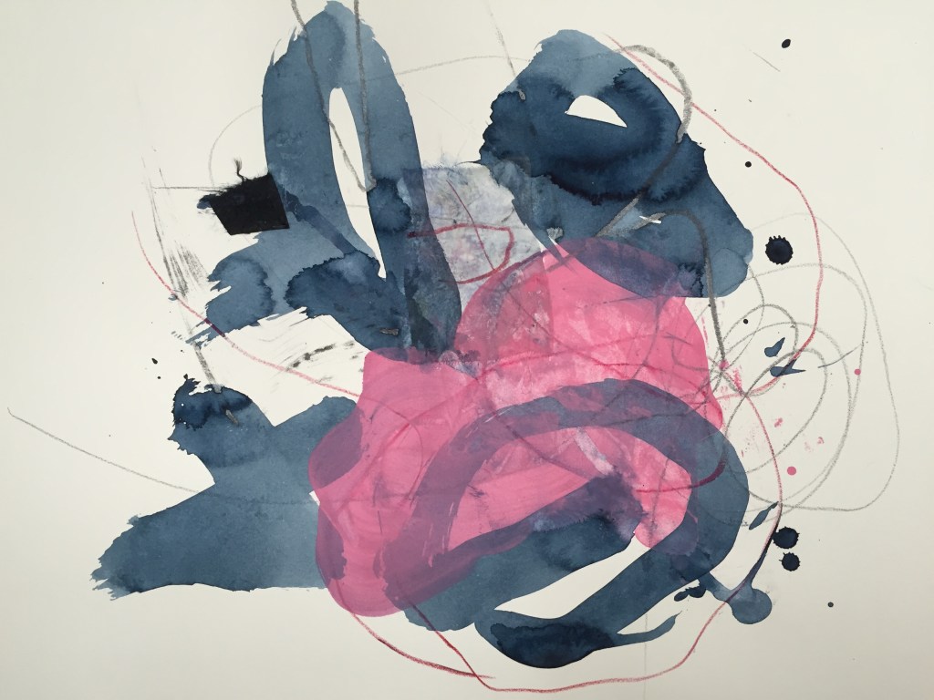 Saturday morning. Fog came in last night. The cool air feels nice. Jack and Fiona resemble children more than babies. They’ve taught me how sweet strawberries are. My studio time is short, I don’t waste moments. It suits me. The indigo watercolor, the re-purposed prints, the collage. I can feel it now. Want to paint. Need to take Billy for a walk while the babies are napping. 8:21 A.M. Mini Chunks. That’s what I’ll call it. “Jenny Hynes guide to getting it all in” The Mini Chunk System. Yesterday I forgot to leave downtime until 7:30PM. I had to clean the house for our visitors, Linda and Tracy from Early Start. I kept thinking I was almost done. Looking at the clock, 11:00, wash dishes. 11:20, wash pots, pans, bottles. 11:37, and I still have to mop the floor. No Coffee Break before Fiona’s evaluation. Felt like a real Domesticated Animal. I peel off my apron, damp and dirty from housework. 12:00 PM, babies’ dressed, clean diapers, house clean, wearing a dress, lipstick, hair pins, but no bra. Couldn’t wear a bra, too hot. Looks slutty, hippyish, I don’t know. Wouldn’t go out in public. Babies and I having a great time while the nannies away. Even though Ramona only comes two days a week it’s a big difference than no days a week. It’s nice to have my house back. It stays cleaner, (which probably means I spend too much time doing) but it feels good, the babies hardly cry at all, only whining, especially Fiona. That’s because they can’t say what they feel, want, or need. That’s my project. I need to really focus on learning sign language and teaching Fiona words and explaining how she’s feeling. The babies seem to be taking a nap now. Time for Billy.