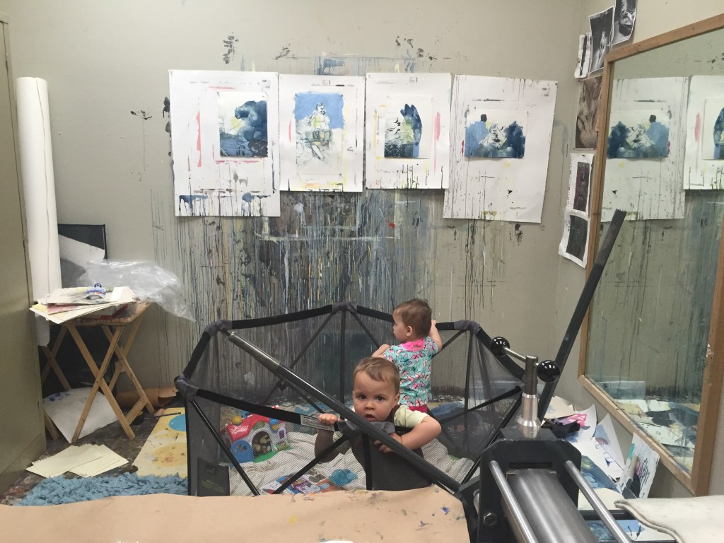 I think I blew Jack and Fiona’s minds. They watched me mix a grey acrylic and brush it onto a painting hanging on the wall. Then I added blue, overworking most of what I thought may have had promise when I first started. But it didn’t matter, I didn’t mind. I thought I was going to have another two hours of un-interrupted studio time. I put the babies down at 2:00pm, the standard afternoon nap time these days. They seemed tired, which was surprising because they did take a long morning nap. Jack was still fighting off the bug, I thought maybe Fiona was getting it. I set up my studio for painting, re-working a bunch of pieces. I tore up the old prints and paintings to make them new again, laid everything out, filled a tub of water, and began to think about my palette. I hear Jack scream, “MAMA”, which he’s began to use quite liberally. I go upstairs and I hear him scream. I go in the room where he’s sleeping and I hear a weed blower outside, it scared him. It is really loud, I can understand him being scared. He still seems tired so I bring him down to the nursery and put him in his crib. Back in my studio I hear him on the monitor, “MAMA.” I realize he’s not taking a second nap. I decide to bring him in my studio. He’s excited but wants out of the play pen. Then I hear Fiona on the baby monitor. So here we are. I tell the babies, “this is where I am when we’re not together.” I start painting for pure fun, using bright colors, large shapes and collage. It’s fun sharing this part of me with Jack and Fiona. Most of the paintings don’t make the cut but I call them Baby Inspired and will continue to explore this path.