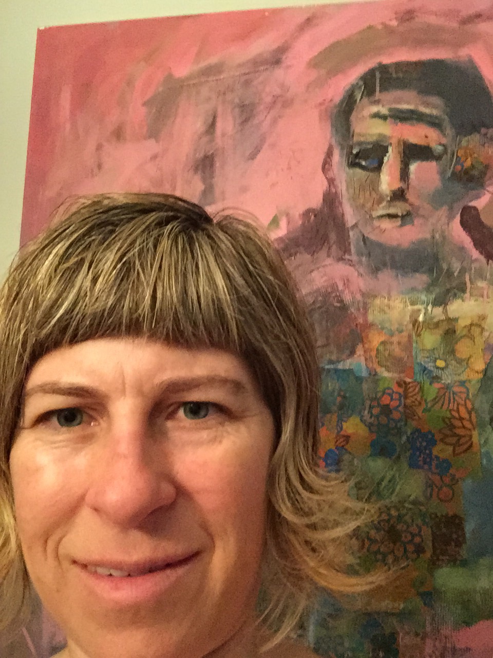 I’m glad I have been able to change. This painting behind me was painted almost five years ago. Many people have told me the painting scares them or makes them feel sad. It’s not a happy painting, I was going through a very difficult time when I made that. It has stiching in it, my hands and fingers were all cut up and sore from pushing the needle through the tight hard canvas. I obsessed on this piece, working on it over and over. That’s how I used to work. Then get really depressed when I didn’t like what I made. These tendencies are still inside me. They always will be, but it’s a place that’s not healthy for me to live in.I like where I am at present. Now I’m going to clean my closet!