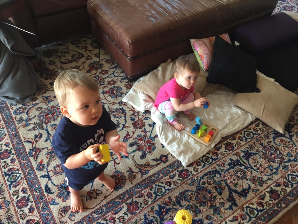 The other difficult transition during this phase is nap times. When Jack and Fiona turned one year old I was ecstatic. They finally started taking two naps, one at 9:00 and one at 2:00. I could really depend on those times to relax or work in my studio, or clean! This lasted a wonderful three months. Then all of the sudden they didn’t want to take a nine o’clock nap or worse one would and one wouldn’t. This lasted several weeks until I decided I would try to transition them to one nap. It’s unreliable still, for example yesterday they didn’t take a nap until 12:00, and it was only an hour and a half. Today they went to sleep at 9:30 and are still sleeping now, it’s 11:45! I have no idea if they will take another nap today or will stay awake until bedtime and get super cranky at 4:00pm. It’s been hard to plan stuff, like going to the gym or making play dates.