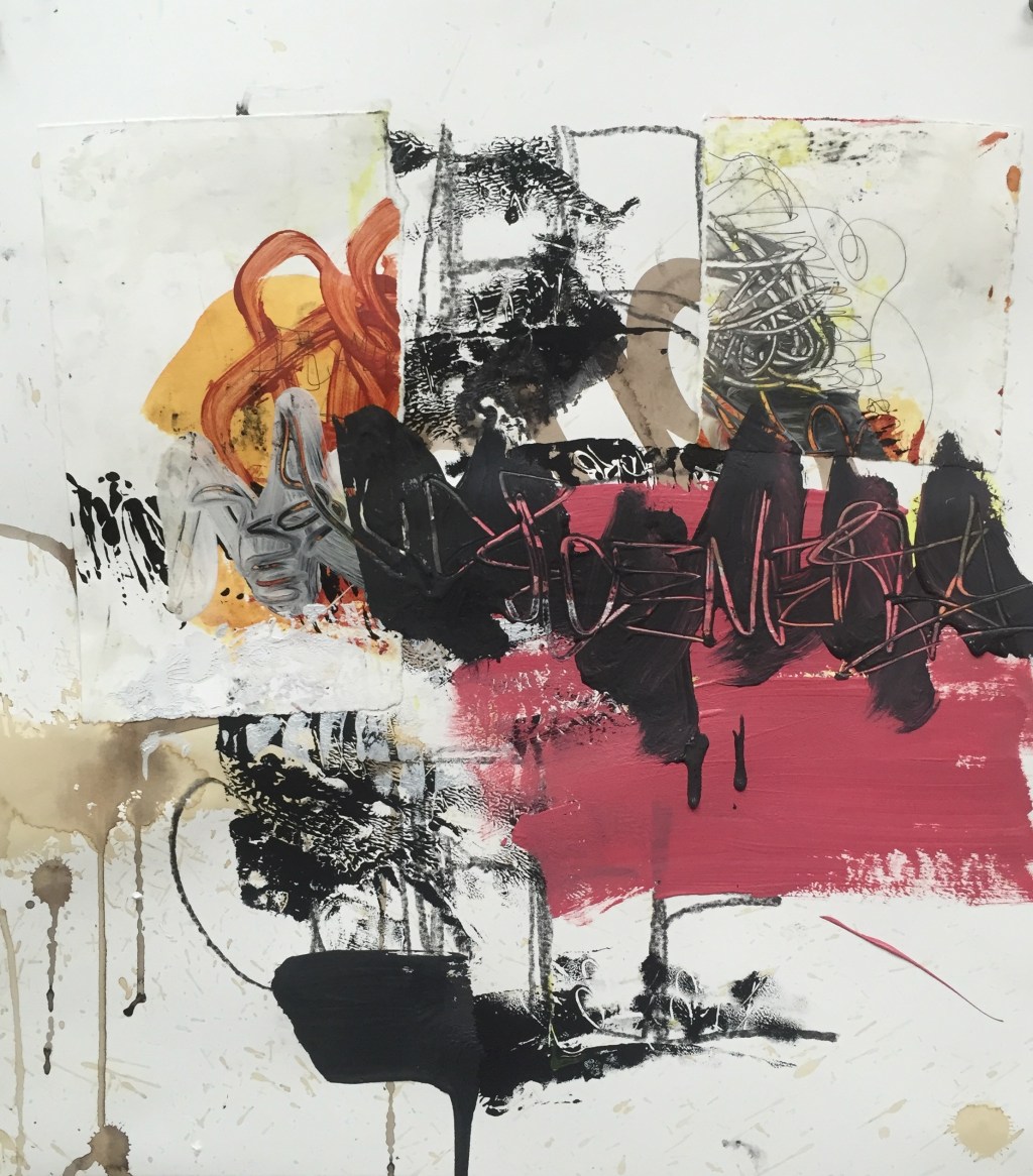 I find half a cup of black coffee from this morning, “Oh cool, I can use this now in my studio.” I head down as quickly as possible, Jack and Fiona just went down for their nap, I probably have two hours to paint. I start to feel better immediately as I tear and prepare my paper, pour coffee on it, collage, write, make a mess. I’m not depressed, I’m not thinking about anything else but what I’m doing in my studio and I’m not really “thinking” about it, it’s just happening. My “nap time paintings” are mostly overworked today, but that’s O.K. In the past this would also make me really depressed, a bad session in the studio would keep me up at night, I would obsess over the mess I made until I made something “good” that I liked. I’ve learned that’s not important anymore, to make something “good.” I know every so often I hit the right note and I can’t hit that note without making all the crap. I get a nice long session today, I’m finished in here before I hear a peep out of the monitor, brushes clean, all paint tubes closed, lights off and I head upstairs.