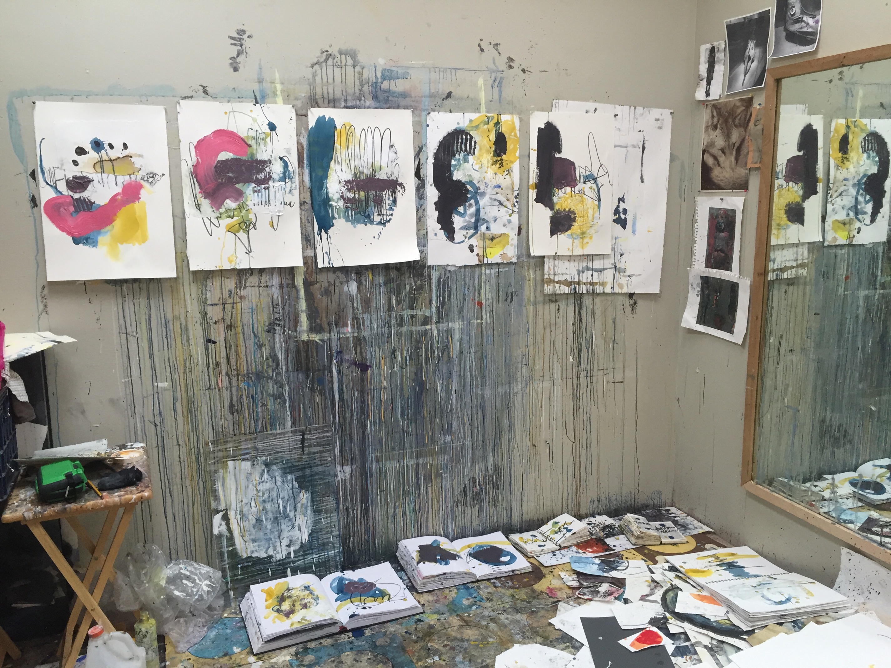 I find half a cup of black coffee from this morning, “Oh cool, I can use this now in my studio.” I head down as quickly as possible, Jack and Fiona just went down for their nap, I probably have two hours to paint. I start to feel better immediately as I tear and prepare my paper, pour coffee on it, collage, write, make a mess. I’m not depressed, I’m not thinking about anything else but what I’m doing in my studio and I’m not really “thinking” about it, it’s just happening. My “nap time paintings” are mostly overworked today, but that’s O.K. In the past this would also make me really depressed, a bad session in the studio would keep me up at night, I would obsess over the mess I made until I made something “good” that I liked. I’ve learned that’s not important anymore, to make something “good.” I know every so often I hit the right note and I can’t hit that note without making all the crap. I get a nice long session today, I’m finished in here before I hear a peep out of the monitor, brushes clean, all paint tubes closed, lights off and I head upstairs.