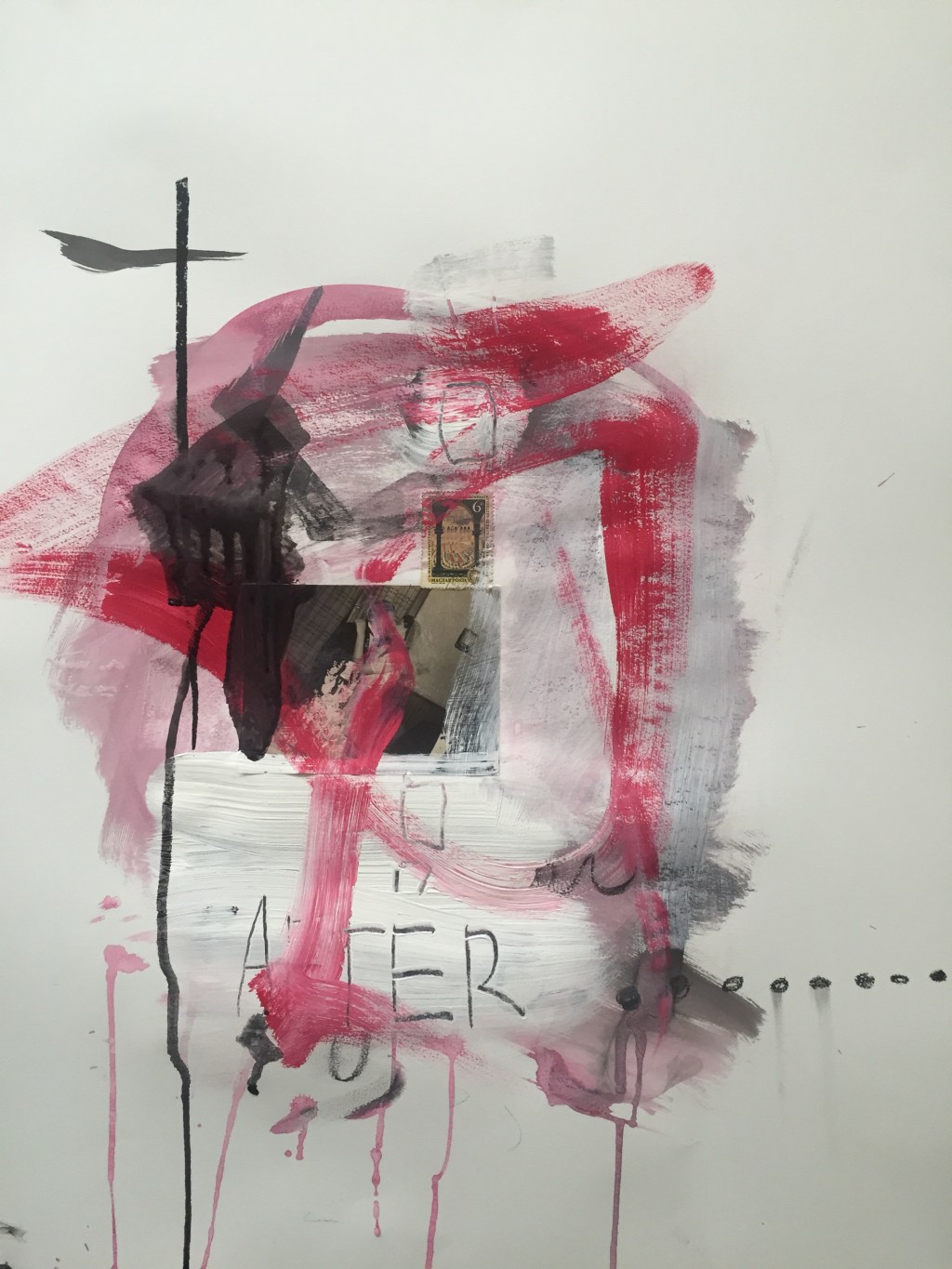 Paper scraps in various colors and formations litter the floor and every surface in my studio. My hands are damp and cold from just washing them, wiping them on my apron, which is damp, I feel a slight chill on the top of my thighs. It’s the same feeling of walking through a damp concrete underpass. My shoulders are cool, Jack is starting to make little waking noises, I think he has a crumb stuck in his throat. I had time to do some naptime paintings and now it’s getting close to the end of naptime.