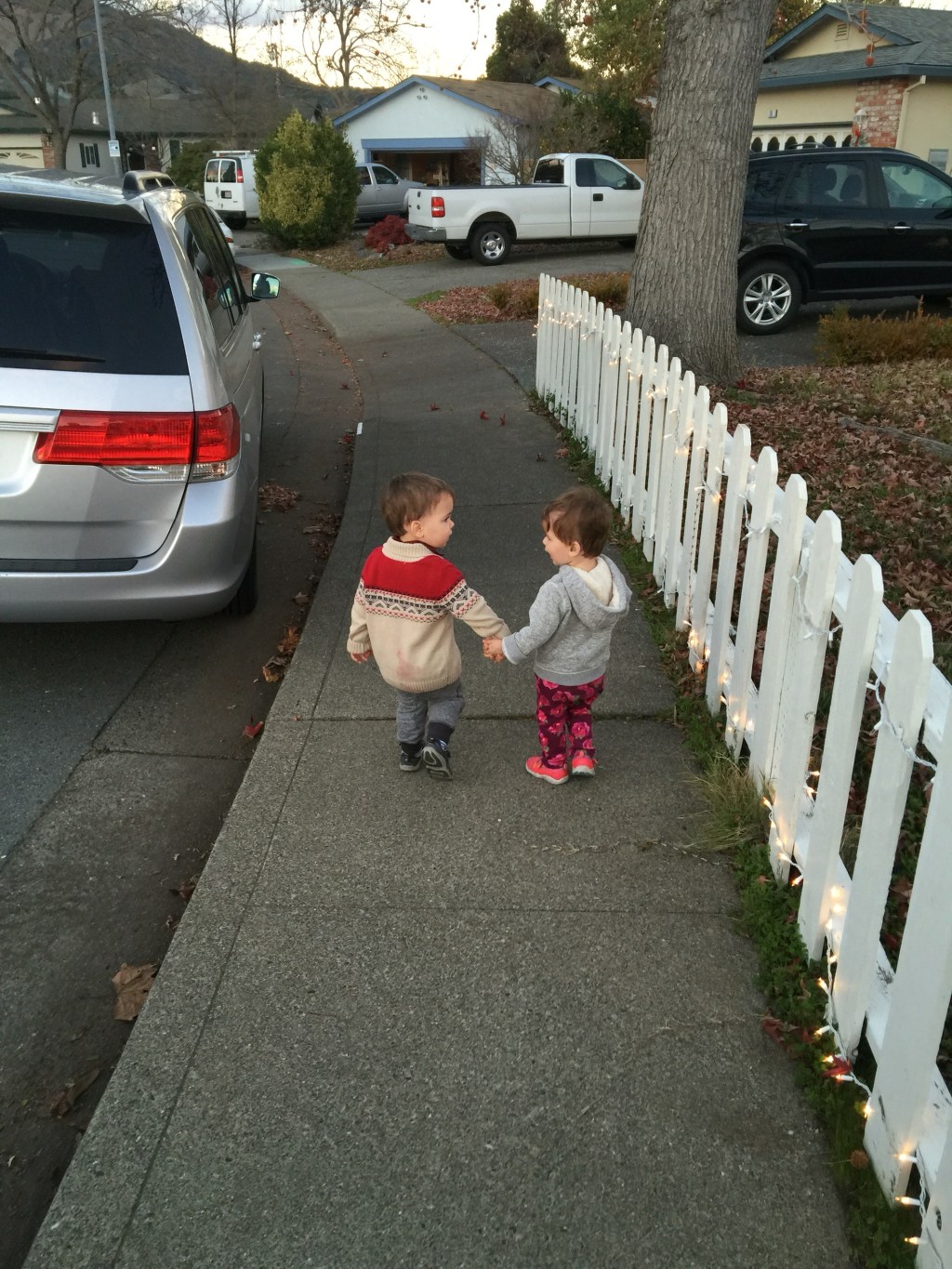 Alan and I took a walk outside during the party. It was surreal to be walking down the road on Christmas outside a family Christmas party with two children that are my own. After years of parties where I felt so uncomfortable and like an outsider because of my troubles getting pregnant, now I had a family of my own. As we walked down the sidewalk Jack looked at Fiona and said “ona” he grabbed her hand and they continued to walk together in front of Alan and I.