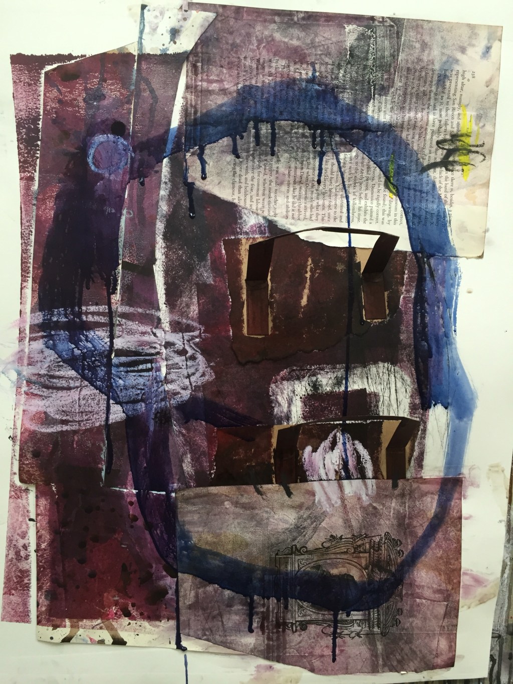 I start working on my GAP book, no, I can’t show you any pictures of that. It starts to hum. I pull out paper, rip it in half, go to rip it again.No. My papers always too small for what I have to say or show. I set up my press. Tension on. Blankets. I print with fabric I made into an apron last week. Today I cut it up. Use the pieces for collage and collograph.