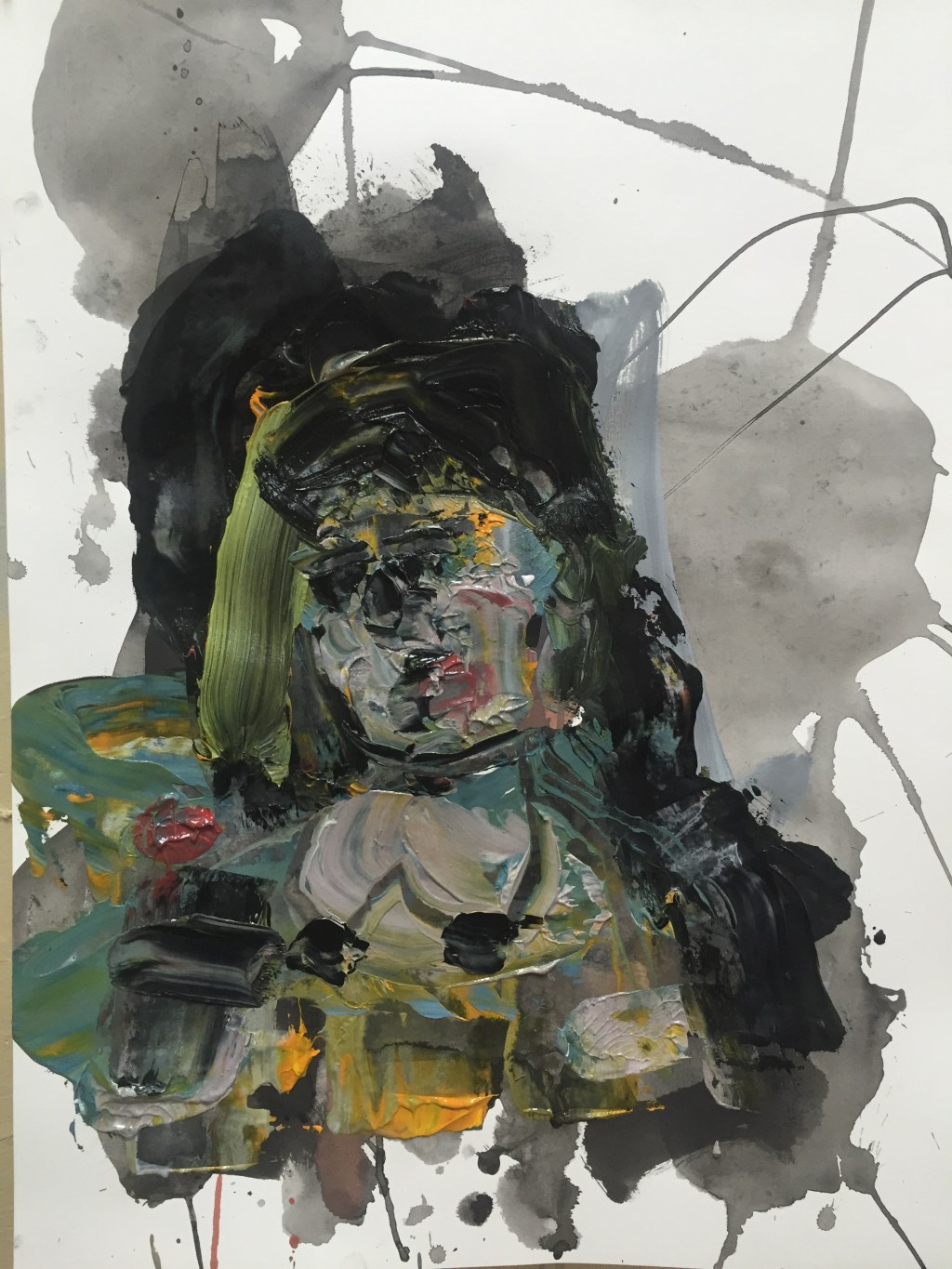 5:00 AM Saturday morning. Drinking coffee, eating rye toast with almond butter, but this morning there is no hum of the refrigerator, reflections of lights on windows, shadows of toy horses and doll houses in my view, today I am surrounded by piles of edited paintings, my favorites, an assortment of work hung on the wall, my funky portrait series, part of them wearing dunce caps, my collection of trinkets and curiosities, because I’m in my studio. I can do this now, it’s super clean and organized. My desk is clear, I can sit here and write, drink my coffee. The only problem is I want a second cup of coffee, I have to go back upstairs, opening the garage door super quietly, tiptoe up the stairs, pour another cup, then repeat getting back into my studio without the babies or my husband hearing me. I think I need it; I’ll be right back. I did it! As Jack likes to say. As I walked up the stairs I peered out the window to see the outside world, scattered clouds in a still dark sky, entering the kitchen a waft of my life rushed towards me, smells of last night’s dinner, the coffee I’m about to pour myself, the sounds I’ve become accustomed to listening to while I write. I almost feel like bringing my computer back upstairs, proceeding with my usual routine.