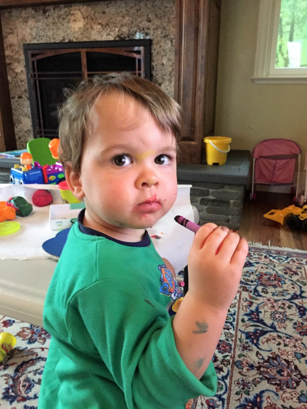 Fiona stays painting much longer than Jack, he wants to watch T.V.! And since it’s a stormy Saturday afternoon and we are partying like there’s no tomorrow I let Jack watch T.V. to his heart’s content. When Fiona is done painting I move the little table over by the T.V. with playdough and crayons and coloring books.