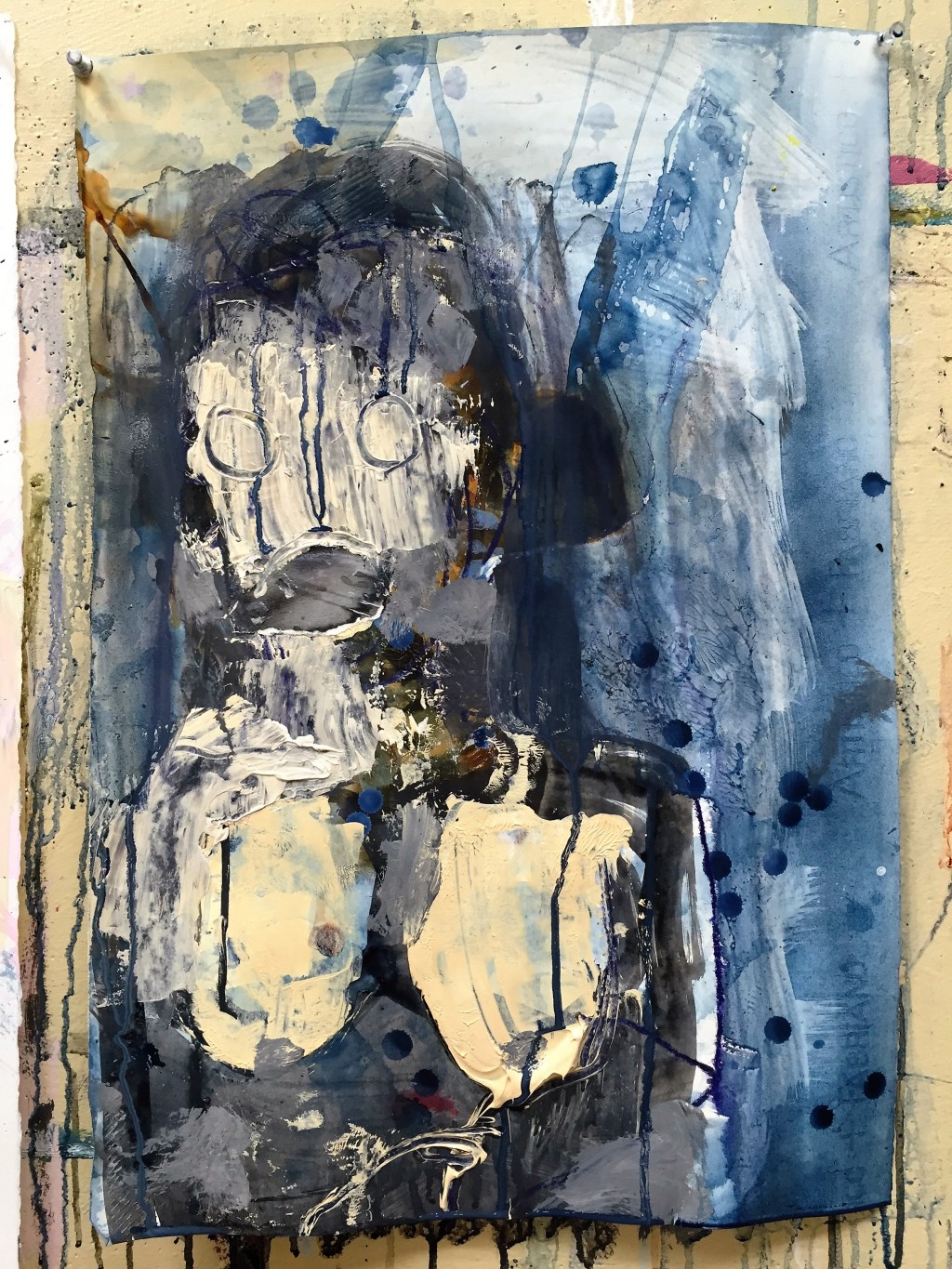 Old blue paint. Mixed in the past. “oh cool, I can use this” to get me started. To be a gateway to the days’ work. To start off my time in my studio I have today. Time I’ve been short of for a while now. I have a sitter today. I worked in the morning on projects organizing crap on shelves and nooks. Deals purchased on Amazon we don’t need. Extra packages of boogie wipes, butt creams, potty watches, instruction manuals, an infra-red camera, nuts, screws, coins, things I try to put out of reach. “I’ll deal with it later” I keep saying, until the box of things gets moved to another location, somewhere hidden. “I’ll do this project later” I say. Until there’s boxes of miscellaneous things in every closet, up high. Forgotten, replaced with a purchase of the same exact things because we’ve forgotten we already have them.