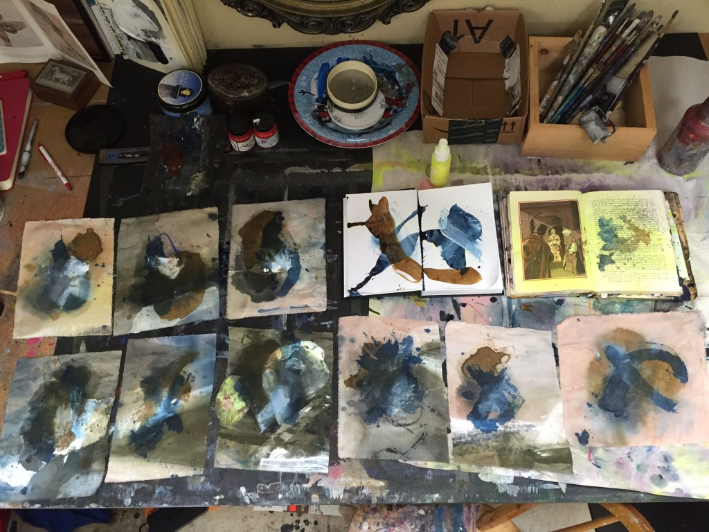 My five fingers covered in blue, black, and brown fabric paint and ink. My palms stained, even my wedding ring is stained from the brown ink. I sit in my studio in a sea of little fabric paintings, four larger works on paper, all abstract. All almost done or done. What inspired me to work freely again was starting more notebooks, they had a sale at the art store, half off, I bought five. As I came in my studio this afternoon, after lunch, I hated my large fabric painting so took my scissors, made a little cut and ripped it up. Made several little squares, revealing fascinating little paintings. My first thought, put them in a book. A collection of several thoughts, experiments, ideas, mistakes, and successes. I want to paint another face, a figure, I am obsessed again, but at the same time I want to paint abstract, experimental. It feels good to have the burden lifted off my chest, the burden of if it makes economic sense to work in here, to take the time for myself to be in my studio. I decided it was totally worth it by any means necessary. Think it, feel it. Do it. I will not question my need to make art and write. A teacher once told me to “Go in your studio no matter what, even if it’s just to sit and do nothing”