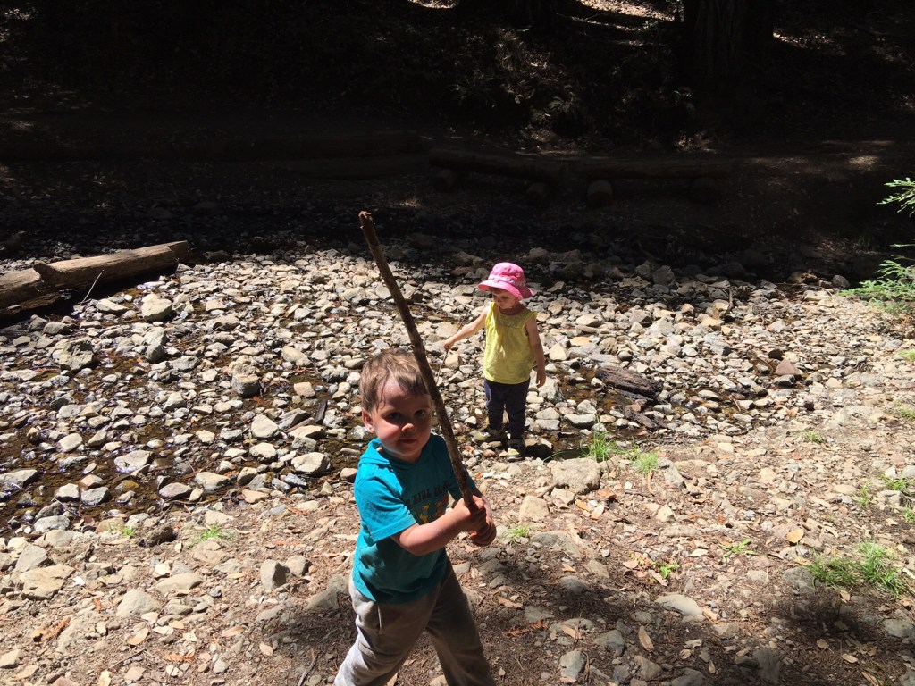 It makes me think about yesterday. Alan, Jack, Fiona, Billy, and I went on a hike to Lake Lagunitas. It’s a three-mile hike, rolling trails around the lake. We decided not to bring the back pack carriers or the stroller! Quite a gamble I thought, but Alan said having the backpacks just makes them want to be carried. I agreed and took the chance. I didn’t know it was going to be 95 degrees out!! But I did expect to take lots of breaks, so my head was in the right place. We stopped at a bench right by the lake and watched dragon flies and ate watermelon five minutes into the hike. It went like this the whole way, stopping under the trees where swarms of woodpeckers flew around pecking and singing. Stopping and gathering pinecones and sticks and dirt that was “popsicles and dinner”. We stopped by the creek and ate lunch, and changed poopy diapers. We stopped in the middle of the trail and sat, “Lets relax” Jack said. I followed along, reminding Alan not to keep telling the babies to “come on”, to let them rest and explore and play in the dirt. Toward the end of the hike, where the trail turned into a fire road and the shade from the trees was gone we carried them for a small stretch. I started to get scared, I was afraid they were overheating and over tired. We got to the final stretch and Jack wanted to walk naked and barefoot. I let him. “Are you sure? You might step on a rock” I said. “Yes, I’m sure” Jack said. I let him. I let him walk naked in the stream at the end of our hike, I put my feet in the cold water. Alan didn’t let Fiona, he took her straight to the car because he felt like we were running out of time, we had early dinner plans with family.