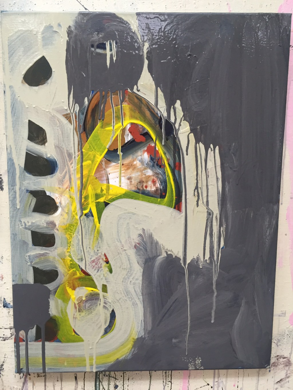 Been thinking a lot about paintin’, been paintin’ a lot. Have painted over everything I’ve made lately four or five or ten times. My work for SIMPATICO is at the frame shop. Lucky for me and lucky for it. I may have ruined it all. My hands are covered in paint, strange because: I didn’t have the energy to work in my studio today or write. But here I am doing both. My recent series, in preparation for SIMPATICO, I have gone down a dark path of phylos, burnt umbers, red- blacks, blue -greys, garish pinks, rusts, yellows, figures appearing at times, yelling and screaming, keeling over in pain. I’ve exhausted pieces of paper, my brain, and my body. Obsessive and detrimental; I can’t stop. Pulling out the large canvas ripped open a deep crevice inside me. From the beginning. Painting on large pieces of found wood and Masonite. Large un-stretched canvas tacked on the wall. Painting over and over them until a texture built up on the surface. Like my body. Covered in a thick callus, a chronic thickness evenly distributed on my most used parts. I am growing out of my studio and my mind. I paint obsessively. I must use extreme mindfulness techniques to remain fully present when I’m parenting. I’m very successful at it. If I feel myself slipping away, thinking thoughts like, “I could put on the T.V., give them a popsicle, and run down to my studio.” When these thoughts pop in my head I use re-direction with myself. I figure out some way to get engaged, I watch, I draw and write in my journal, or with the babies, we play playdough and play dirt in the garden. It works. I love my babies so much I don’t want to take for granted the time I have with them. In between all of this I find myself slipping away in despair when I listen to the debate and hear about shooting after shooting. The paintings gain even more importance to me; I have to express myself; PURGE my Soul. I went to the SF MOMA the other day and left questioning what I have to offer as a painter anyhow? Why I paint? What’s unique about my paintings? I do know why I paint, I can’t not paint. My paintings are only unique because I am a unique person and they come from inside me. This makes my paintings necessary to myself, my existence, which would make my painting important to my family too, because I have a healthy outlet. That’s why my paintings exist and why I want to show them, and why SIMPATICO IS.