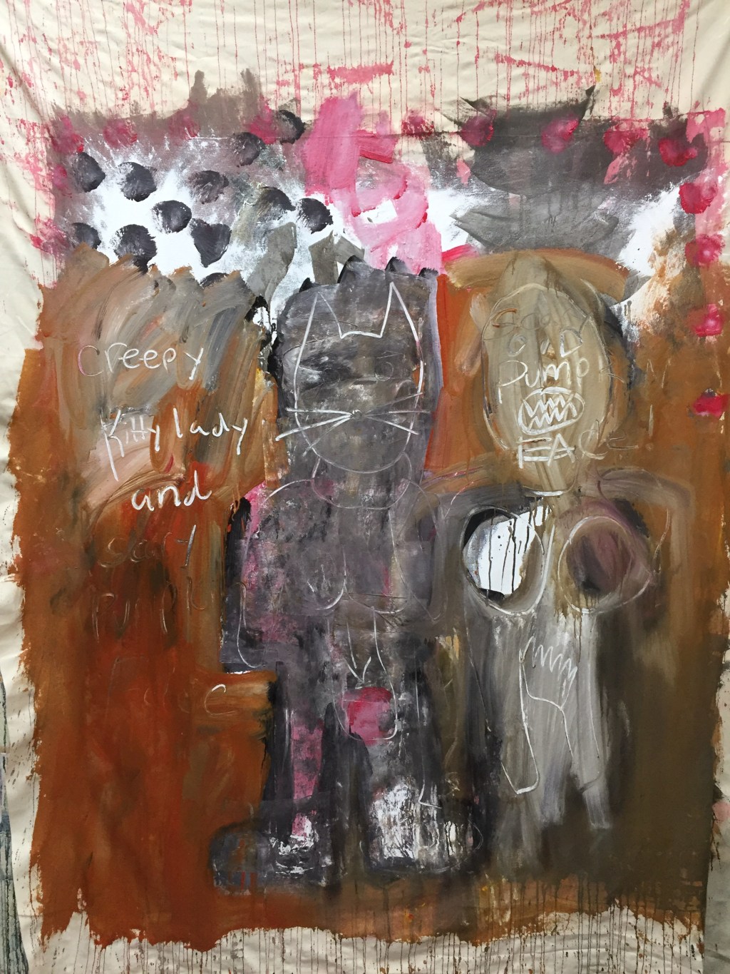 Sunday. A DAY I normally don’t spend in the Studio. But it’s naptime and I haven’t been in my studio for days. This was a must. And Good Thing! I painted “Creepy Kitty Lady and Scary Pumpkin Face”. An acrylic painting on a large unstretched canvas. I LOVE it! Since I’ve decided to focus on painting for awhile I’ve completely gone back to my roots. My large unstretched figurative canvases. I had to get in here today. Naptime was my only option.