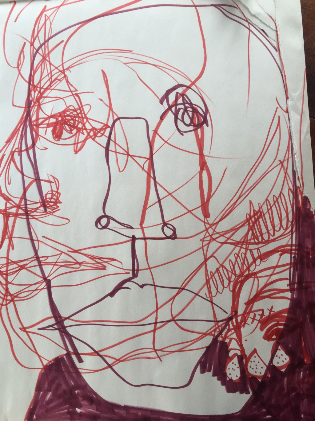 They took a nap today. I’m so glad, they needed the rest and I needed a break. I made myself not clean. At first I didn’t know what I would do, feeling the way I do. I get out a pad of newsprint and box of pens. I turn on my computer. I start to doodle, then draw, draw rapidly and freely. I write. Now my time is coming to an end. Jack and Fiona will be up soon. My husband will be home. I need to do a list of things. I don’t feel like it though. I feel like just sitting and doing nothing for the rest of the night. Then just going to bed.
