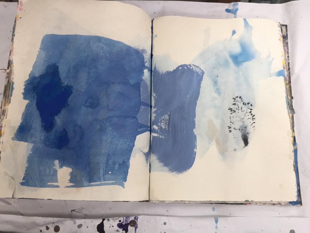 I’m sitting in a black and white skull dress in front of a grouping of black and white drawings; A powerful portrait in charcoal by William Kentridge hangs on the wall in front of me. I think to myself, don’t need to rush, I can spend as much time as I need to. I stand in front of white canvases listening to the collage of footsteps, how they echo from the other side of the wall, no faces, only sound. Jasper Johns paintings, every time I see them I look at them in a new light. I recognize a piece of myself, understanding things in these paintings I hadn’t understood before. I have moments of memory flash through my being, remembering sitting in front of these giant Clifford Stills, on my lunch break, or after work on my way to Bart. I spent so much time at MOMA I wonder how much influence these Abstract Expressionistic paintings had on my practice. The Rothko, Joan Mitchell, Jay Defeo, Guston, Lobell paintings I know. I feel like I’m with good old friends. I haven’t seen them in so long; I’ve only been once since they remodeled and that time was with kids. I miss my days in the MOMA, alone. Visiting galleries. I feel like I climbed back over a bridge to a part of myself deep down inside. Today I needed a break, a bath, studio time, writing time. So, Right when we got home today from preschool, I put the babies down for a nap. They fell asleep around 1:30PM. (An hour earlier than usual.) It was so hot and they were so tired and I needed what I needed. It worked out perfectly. Today in my studio I paint in shades of blues, inspired by our meditation on water this morning. I feel like hanging them up in my house to cool things off. My note book entries are beauties too, and I closed the cover of one more note book for my show. I love the quiet right now. I only hear the fridge, the air conditioner and fan. It’s dead hot and quiet outside. Jack and Fiona will be waking from their nap soon. Time to go and make snack!