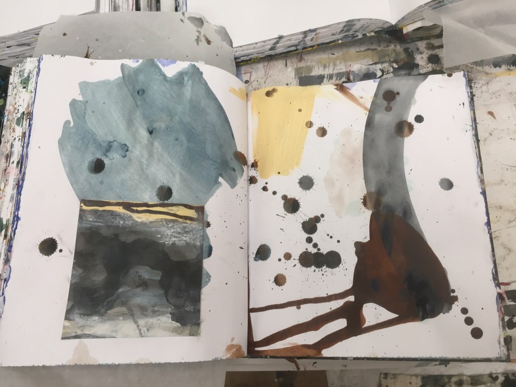 In my studio Ghosts grow. Marks, drips and drops. My time goes by way too fast. Studio days, gone for the week. Today I sat on the deck taking a break from the studio. I remember sitting in the same place, or in the back yard. Listening to Blue Jays and crows, just like today. Having the luxury of time, so much time for the studio. I could keep working non-stop. Now time is precious, both time in the studio and time with my family. It’s good to have restraints, balance. Responsibility.