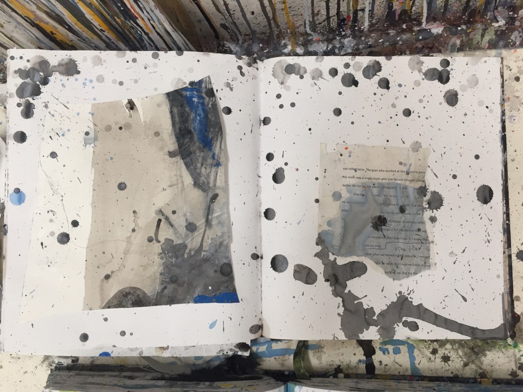 Naptime. Friday. Paintings worked on, getting closer to where I want to go. The layering, the foggy, dusty eyes. Texture creating memory, on the canvas becoming a rivers edge, always changing, eroding and coming back again. On paper, in my notebooks a moment. A flash of time, a scrap of paper with paint drops from several painting sessions, a little mini journal on my studio floor. A tiny scrap, taking on a life of its own. Walked on, stomped on, drawn on, glued on. “Notebook project” taking on a larger life. Prototype made, Rives BFK, four sheets, painted on separately, folded and sewn together, is sculptural, physical. Trying to connect with the canvas in the same way. Getting closer. Not easy. Skin dry, paint spots on it, neck tired, body tired. Still have to be mom. Babies waking up soon. Need to get energy. Had crazy week. Realized I am crazy. Need to take break, need to get head clear. Dentist said I have grinded my teeth down, bad. Need to start meditating again. I lied last week when I say I don’t have moments when I say I need to do this or that, I need to change. I do still say that, feel that. Or should I accept my grinding teeth? Paint every chance I get. Not take a break? Forget to re-order my checks. Forget everything but the most essential? I need to go now. Sit outside in the sunshine before the babies wake up from their naps.”