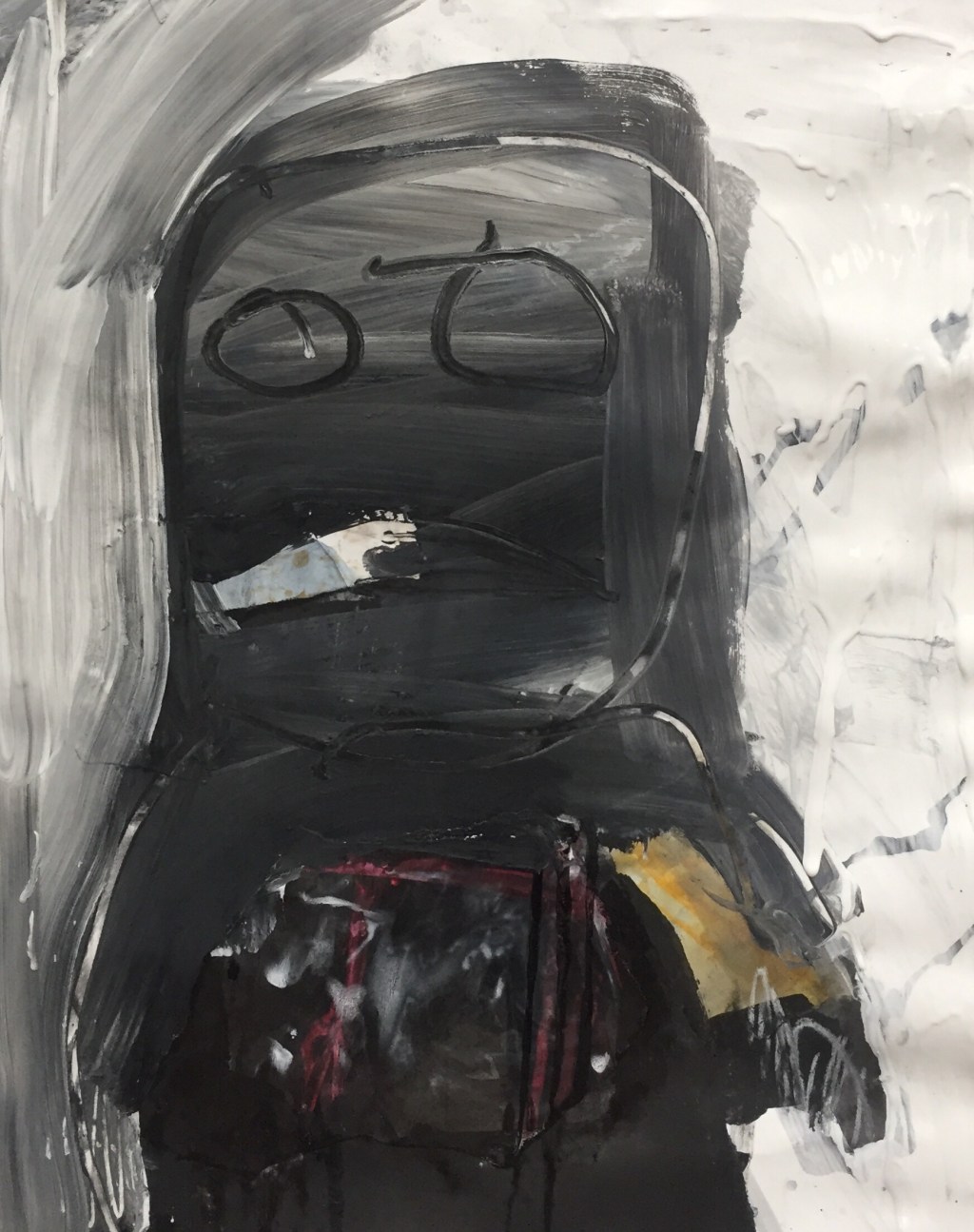 My studio time is almost up now. I worked on paper. Fighting the mush. Crawling my way through the muck. Figures fighting their way back into the paper. Draw, scratch, make a mess. Fighting anxiety of my fear of someone coming home, someone disturbing me. Disturbing my disturbed self. The anxiety of this overtakes me. I have a hard time focusing, I’m so worried someone will stop me from working. I’m afraid someone will knock on the door or worse, open it without knocking. I fight this fear. I fight through this anxiety. I paint, only in black and white. I ruin almost everything. The paper soggy.
