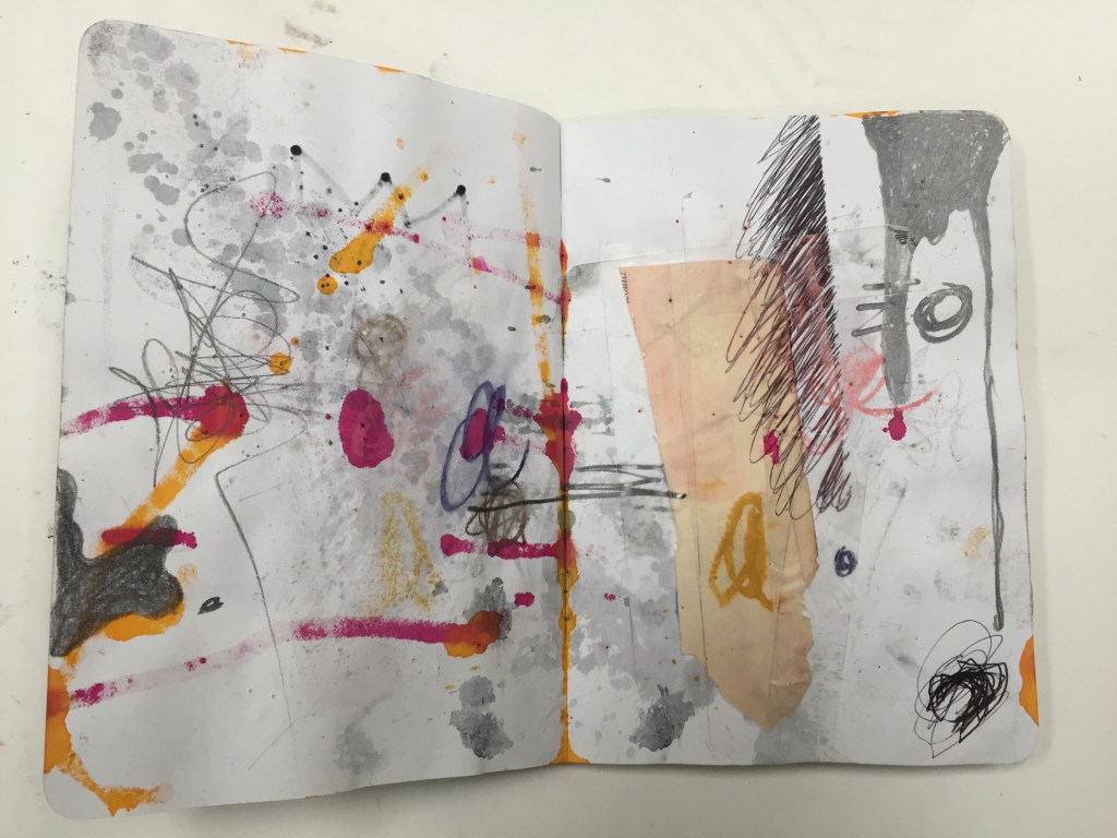 GAP, (The Global Art Project) is a group of artists living in many countries around the world. We work on collaborative projects by mailing “FRAGS” (scraps of old work ripped up, studio floor finds, collections of tickets, maps, ect.) to each other. We then work on collage and mixed media in our own studios. GAP also organizes yearly residencies where members get to meet face to face and work together. GAP has in the past and is currently working on several collaborative sketchbooks, we call our collection of sketchbooks “DISLOCATIONS”. When I saw the BROOKLYN LIBRARY SKETCHBOOK PROJECT, I thought it was perfect for GAP! I initiated and curated the project, along with Carl Heyward, the founder of GAP. I originally ordered one sketchbook, but after I received so much interest in participation from fellow GAP members and I saw how little the sketchbook was I ordered a second one. The first Sketchbook I named Volume One. That traveled the United States and was originally SOLO work. But when the book was finished and returned to me it had grown very thick. I had to make some executive decisions and edit some pages. I used “FRAGS” from the edited pages and in the end almost every page is a collaboration. Volume Two went to Europe first. Switzerland, then Belgium, Spain, and made several stops in the U.S. before it was returned to me. Again, I had to edit and rework the book. It had grown too thick again! I had so much trouble with this sketchbook that in the end it only has four pages. I ordered a third book, Volume Three. This final volume traveled to Senegal in January for a GAP residency. Participants at the residency added to the sketchbook over the course of their stay in Senegal. Carl Heyward returned the last Sketchbook to me when he returned from Senegal and fortunately Volume Three did not need to be edited or re-worked!