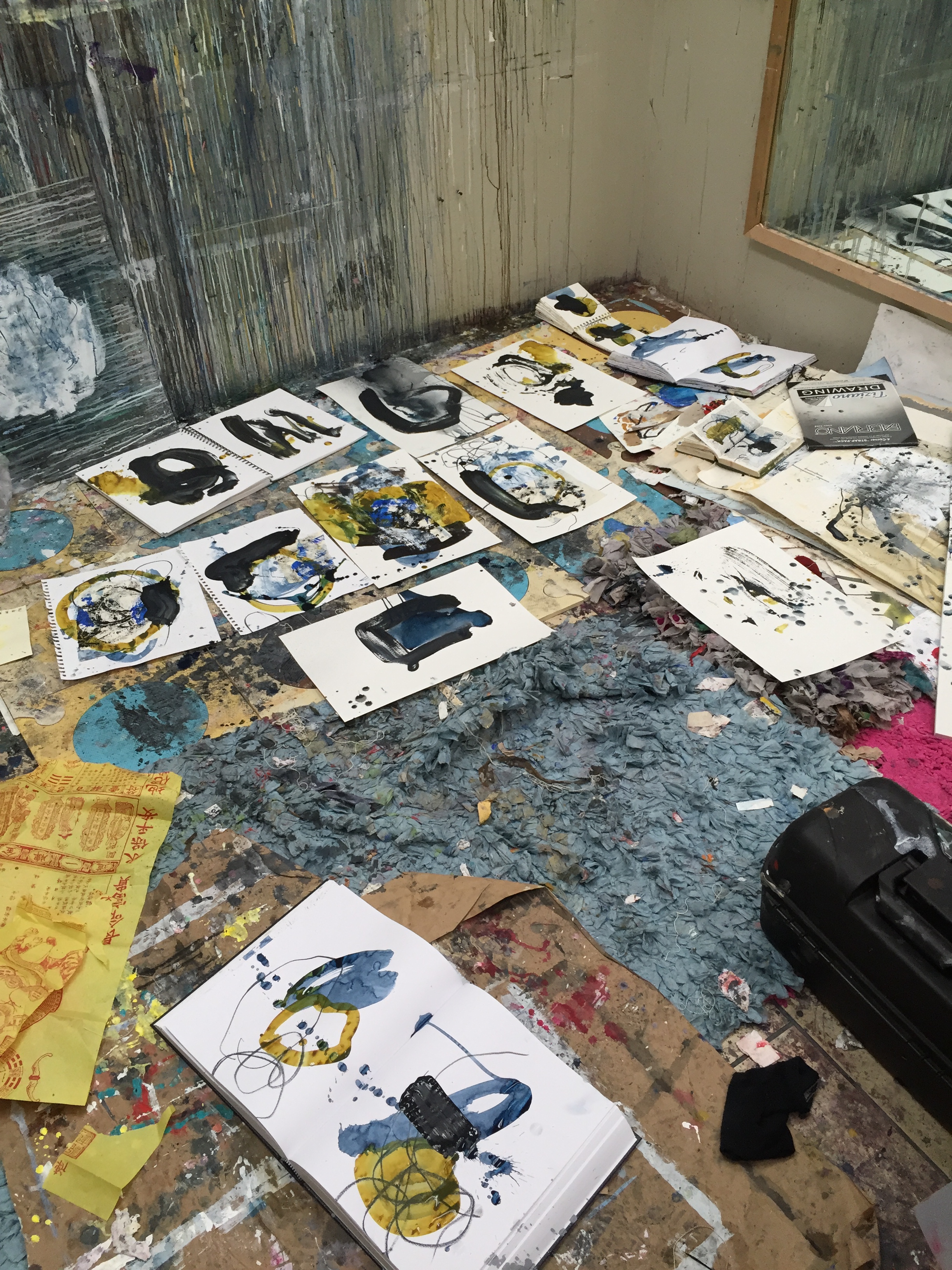 Quiet. I don’t even want to listen to music right now. I’m in my studio, Monday, March 6th, 2017, 1:46 PM. Babies asleep. I haven’t had a chance to get in my studio in forever. It’s been a crazy few weeks of transitions and changes: Jack and Fiona turning three, transitioning to preschool programs, Jack doesn’t start until the 13th, separating Jack and Fiona for the first time, behavioral changes due to all these changes. It’s been intense. I decided right away to just put the studio and writing on the back burner (even though it has been a time I needed it most) but I was so consumed with motherhood and domestic responsibilities I didn’t have any extra time, or energy. Today I finally made it. It takes a while to get into the creative zone. At first, when I came into my studio today I wondered how to get started. I started wondering what to work on, what route to take. It delayed my starting anything, until I mixed some fresh white paint, painted over what had been sitting on the studio floor for weeks. A ghost remained, I started painting and drawing, first using one color, then two, then three, finishing with a slate grey. Letting them dry a little between layers, letting them set up a little. Taking my time. Now I am nearing the end of my studio time today. I have one more hour. Now forty minutes, I opened a bottle of wine, am enjoying a glass and updated my Facebook profile picture!