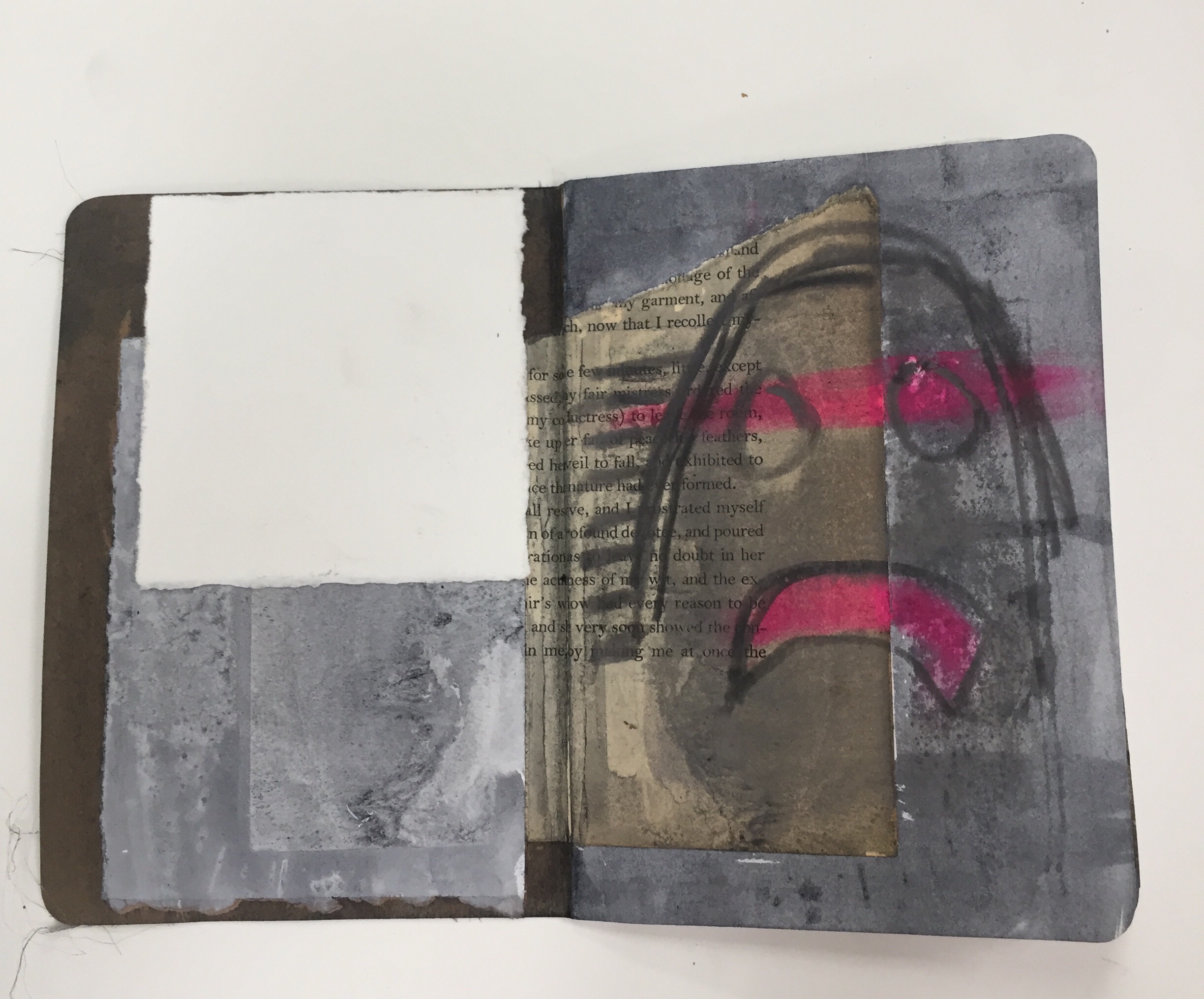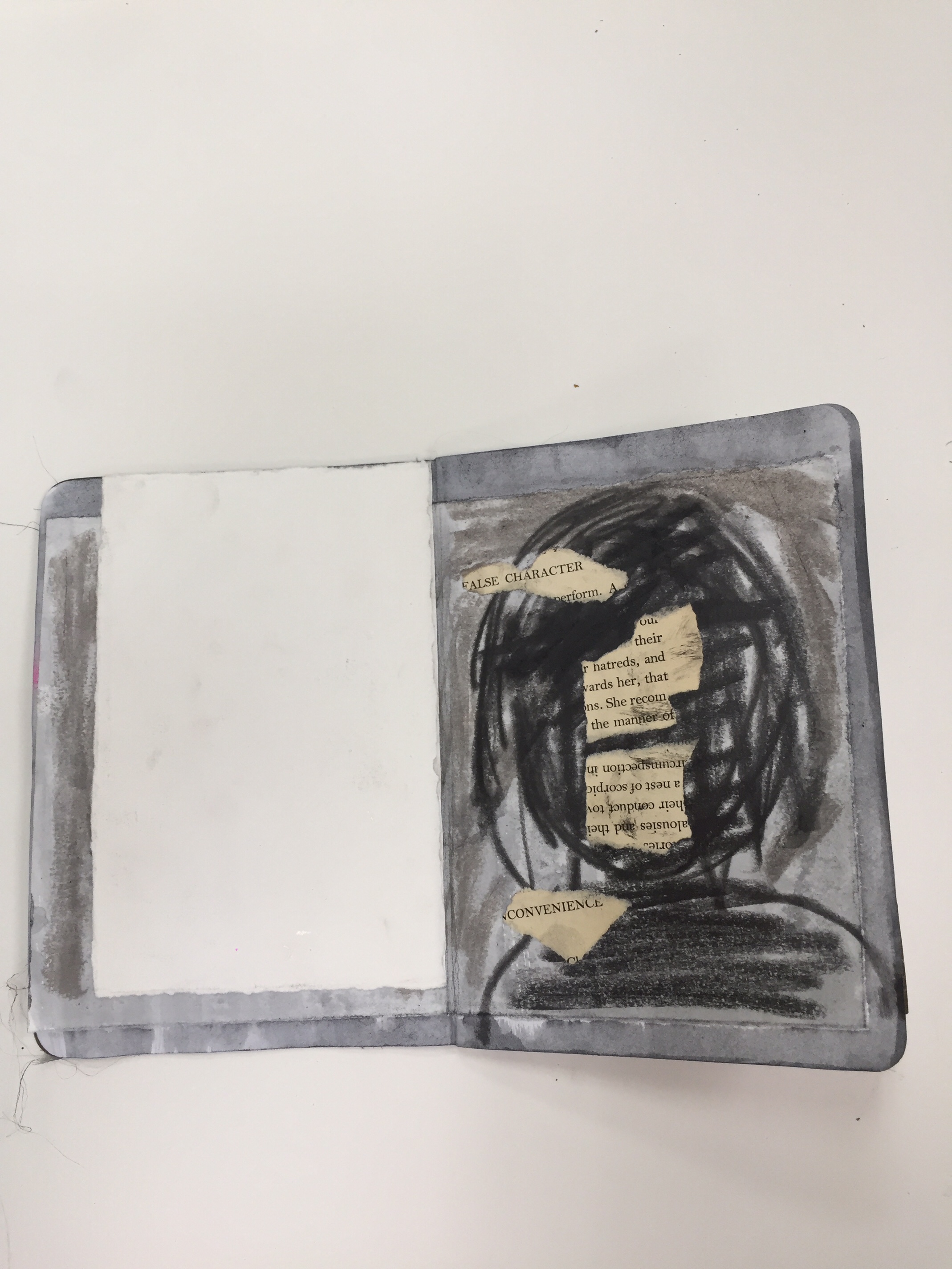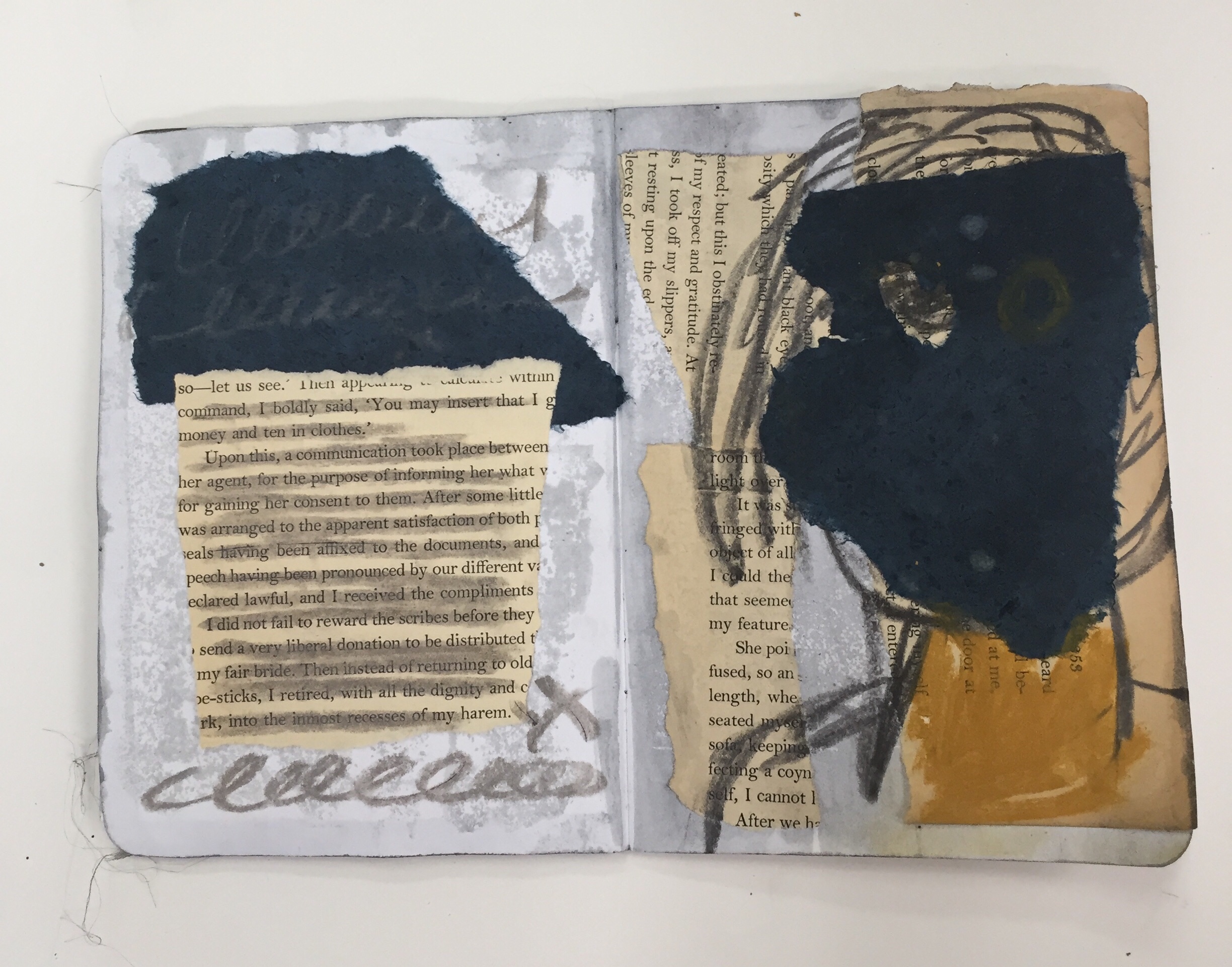 GAP, (The Global Art Project) is a group of artists living in many countries around the world. We work on collaborative projects by mailing “FRAGS” (scraps of old work ripped up, studio floor finds, collections of tickets, maps, ect.) to each other. We then work on collage and mixed media in our own studios. GAP also organizes yearly residencies where members get to meet face to face and work together. GAP has in the past and is currently working on several collaborative sketchbooks, we call our collection of sketchbooks “DISLOCATIONS”. When I saw the BROOKLYN LIBRARY SKETCHBOOK PROJECT, I thought it was perfect for GAP! I initiated and curated the project, along with Carl Heyward, the founder of GAP. I originally ordered one sketchbook, but after I received so much interest in participation from fellow GAP members and I saw how little the sketchbook was I ordered a second one. The first Sketchbook I named Volume One. That traveled the United States and was originally SOLO work. But when the book was finished and returned to me it had grown very thick. I had to make some executive decisions and edit some pages. I used “FRAGS” from the edited pages and in the end almost every page is a collaboration. Volume Two went to Europe first. Switzerland, then Belgium, Spain, and made several stops in the U.S. before it was returned to me. Again, I had to edit and rework the book. It had grown too thick again! I had so much trouble with this sketchbook that in the end it only has four pages. I ordered a third book, Volume Three. This final volume traveled to Senegal in January for a GAP residency. Participants at the residency added to the sketchbook over the course of their stay in Senegal. Carl Heyward returned the last Sketchbook to me when he returned from Senegal and fortunately Volume Three did not need to be edited or re-worked!