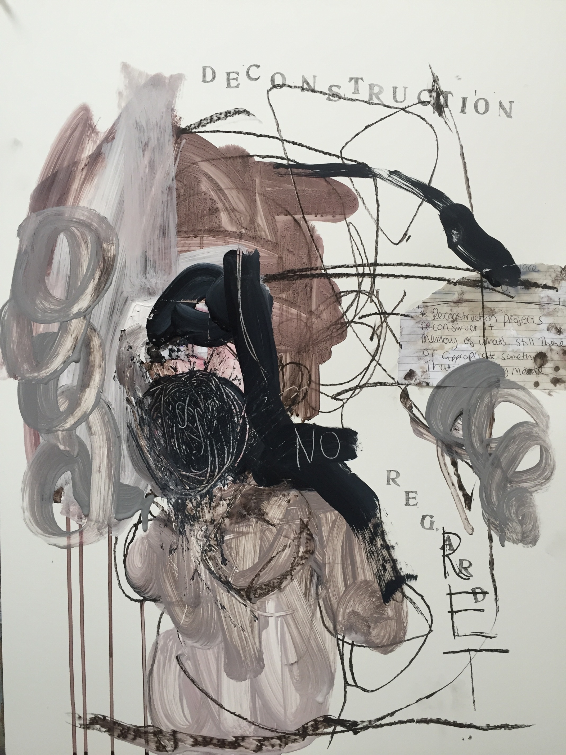 I’m finally starting to see a merging between my old journal pages, paper, and paint. It has been really challenging for me to get a more “literary” feel in my paintings without being too “literal” When I started this week with the old journal pages I got caught up in the words, the memory. When I started attaching the pieces to my paper and adding paint it didn’t make sense. There was no composition and the paint and mark making didn’t jive with the journal pages. I tore a bunch of pages out of my journal and laid them on my studio floor. I added coffee stains then let paint drip on them, I messed them up, I added something from the now. They started to speak to me in a new way, a fresh way. Today I don’t even feel like reading the old entries anymore. Yesterday in our parents group at early start, I told the group what I had been working on and some of the difficulties. The group therapist said “maybe you’re not ready to let go of them yet” I said “maybe” but inside at that moment I felt and knew I was ready, 100% to let go of that story, to those words and the way they were written, the way they make me feel.To only reference it lightly, to turn it into a new story, a new unconfined energy, something in the present. My history will always be with me, inside me, and come out on the page. But I can practice letting go of the constricting stuff.