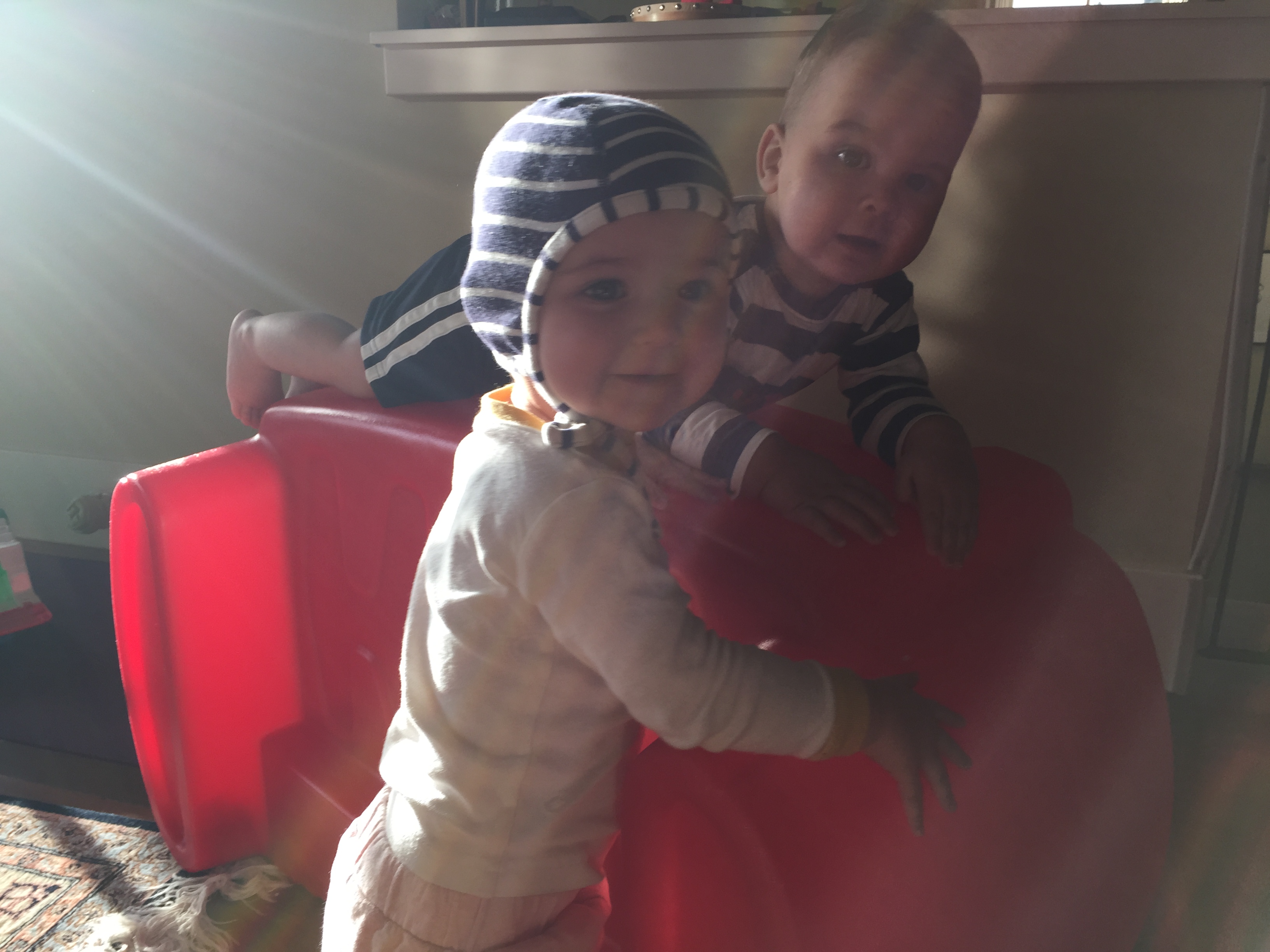 There are three pieces of furniture left in the family room. A couch, that should be able to stay for the duration of this stage of the babies lives. This crazy dangerous climbing, running, stage. The ottoman, which may need to go once they can push it and use it to climb onto the top of the stairwell. And one tall, round coffee table that when left too close to the couch Jack climbs on. My heart starts to race just writing about it. I need to get a bunch of boxes and start packing everything away. Even things on the highest shelves. Especially things on the highest shelves. When they see something they want they will figure out a way to get to it. They are too fast, really fast. My tactic lately is hold one and pull one by the arm. If I don’t have contact with both babies as we travel through the house they go off to find things, find doors I forgot to shut, cabinets I forgot to lock. The other day Jack had a bottle of stainless steel polish in his mouth. I said, “Oh my god Jack!” I grabbed it and put it back in the cabinet. I walk away for one minute to get Fiona or a diaper, I can’t remember which and he’s got the same bottle again! It’s poison! It should be locked in the cleaning supply closet. Along with who knows how much other dangerous stuff scattered around the house.