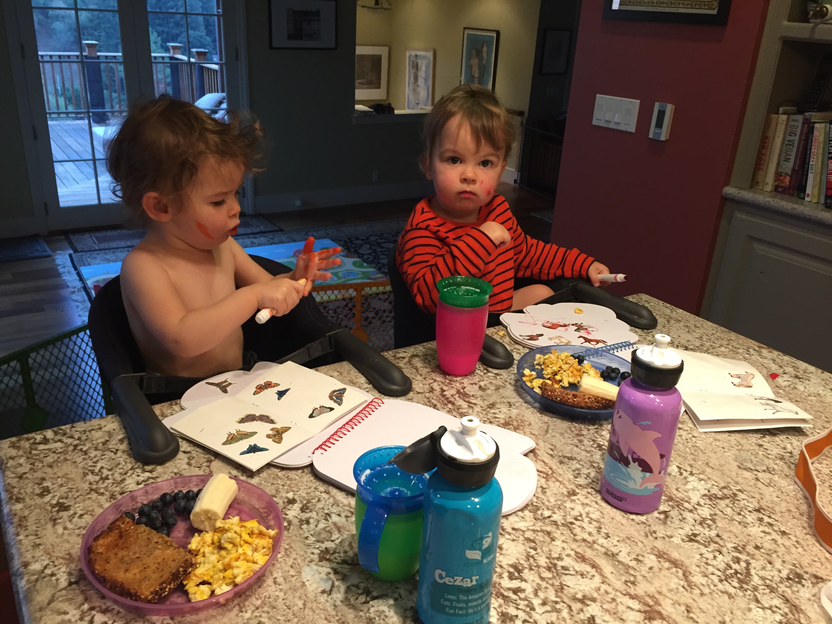 It’s Quiet now, I’m in my studio, babies sleeping. “I’m a little bunny, hop hop hop” still flutters around in my head, my little game I made up as I put Jack and Fiona to bed. I laid Fiona in her play and pack, and picked up her little white bunny and hopped it around so it could say hello to tiger. Both babies went down without a fuss today. It’s been a good baby day, a more “grown up day” It was the first morning since the babies were born I didn’t bring a bottle down to greet them. I brought sippy cups instead with warm milk and had a breakfast of eggs, toast, blueberries, and banana waiting for them in the kitchen. I’ve been nervous about this, “cutting the tit” so to speak, the bottle has been so important to their daily routine. In the morning they cry, “Bottle Bottle Bottle” I thought I would have a revolt on my hands. According to the parenting books I should of taken away the bottle a year ago. This morning they accepted the sippy cup with excitement, possibly it was the novelty. After diapers were changed and we finally made it upstairs, I put Fiona in her high chair first. She started having a melt down. Crying, “down, down, down” The screeches and the twisting to get out of her straps was nerve racking. I thought “Art Therapy” and pulled out the art supplies, showed her the stickers and the melt down stopped immediately. I gave them each their note pads, pens, and stickers. Along with their breakfast and Played a Thelonious Monk record. (on ITunes)The milk got spilled a bunch of times, crayons and markers went in the mouth instead of eggs and berries a few times. But It was a huge success. It was a lot more work than giving them an eight ounce bottle, a banana, and a piece of toast, and letting them watch bubble guppies, but worth it. Bottles done, I can check that off my list!